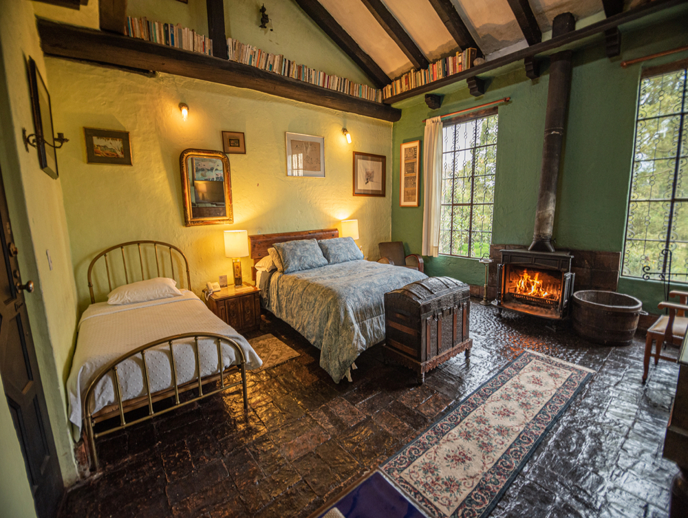 Habitación con vista a las montañas, cama doble + cama sencilla, chimenea, baño con ducha, Direct TV y mesa de desayuno. Capacidad máxima: 3-4 personas.